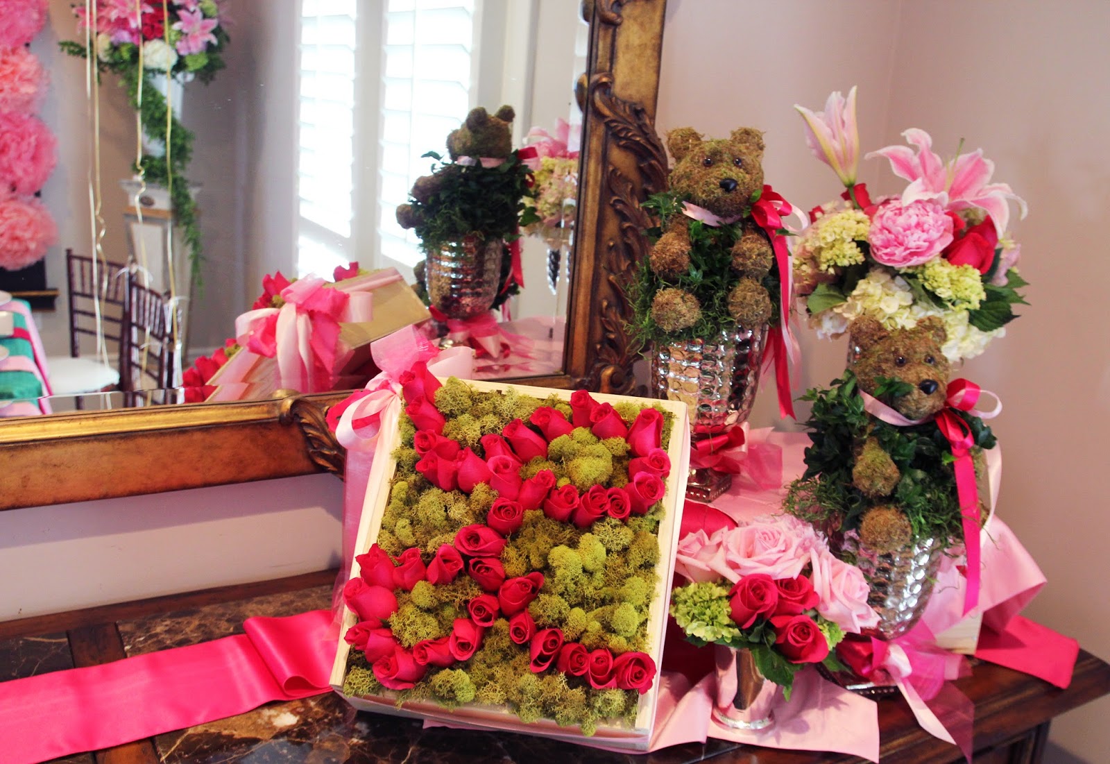 This evening tea was a fabulous birthday party, fit for a princess! Stems brought the outdoors in with their pink, white & green color palate. With beautifully draped ivy, magnificent floral arrangements, 'L' Monogram Rose Wine Boxes and teddy bear topiaries among dozens of cuddly bears, Lily was in first birthday bliss! Enjoy the photos of magnificent floral arrangements and sweet decor for this little angel baby.